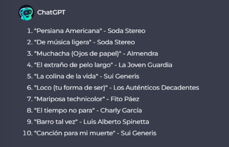Tan solo porque el lunes (otra vez) y el invierno sigue empecinado en no darle tregua a los guantes, en la Redacción de Rosario3 le preguntamos a la inteligencia artificial cuáles eras las mejores canciones del rock argentino. La respuesta que arrojó el ChatGPT, además de polémica, incluye un pifie épico: se le atribuye a Charly García un tema ajeno.