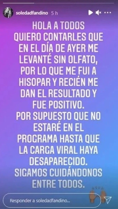 “Hola a todos. Quiero contarles que en el día de ayer me levanté sin olfato, por lo que me fui a hisopar y recién me dan el resultado, que fue positivo”, explicó Fandiño.