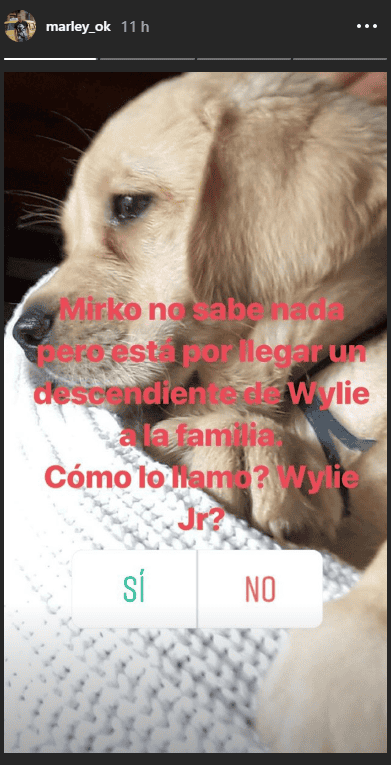 El conductor utilizó Instagram pata comunicarlo. “Mirko no sabe nada pero está por llegar un descendiente de Wylie a la familia. ¿Cómo lo llamo? Wylie Jr?”, expresó Marley en una historia en la que les pide a sus seguidores que voten por sí o por no sobre el nombre del perrito.