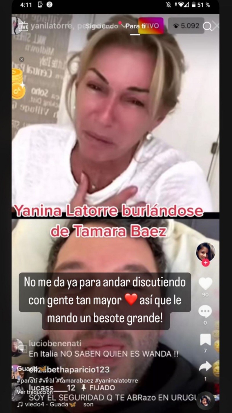 "Tamara está sufriendo, pero yo no le creo nada cuando ya empiezan a llorar todas maquilladas en Instagram", aseguró Yanina. Segundos después, la mamá de Lola y Dieguito Latorre se burló de la reacción de Báez y comenzó a imitarla.