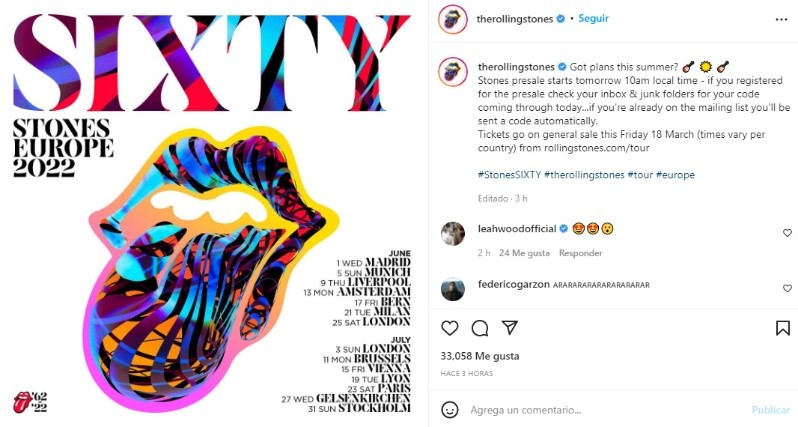 The Rolling Stones anunció a través de un videoclip publicado en sus redes sociales una nueva gira europuea para los meses de junio y julio titulada "Sixty", para celebrar los 60 años de la conformación de la banda.