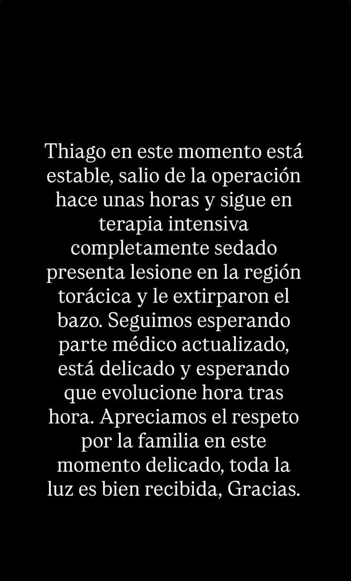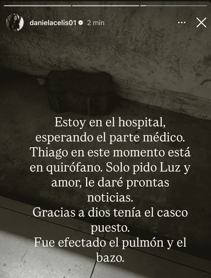 Celis, con quien Medina tiene dos gemelas, Aimé y Laia, compartió la angustiante noticia a través de sus redes sociales: "Estoy en el hospital esperando el parte médico. Thiago en este momento está en el quirófano. Solo pido luz y amor. Les daré noticias pronto. Gracias a Dios tenía el casco puesto. Fue afectado el pulmón y el bazo".