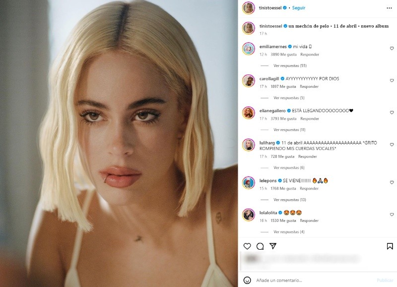 La cantante publicó en redes sociales una foto con su nuevo look –ahora lleva el cabello rubio y corto– y escribió: "Un mechón de pelo. 11 de abril. Nuevo álbum".