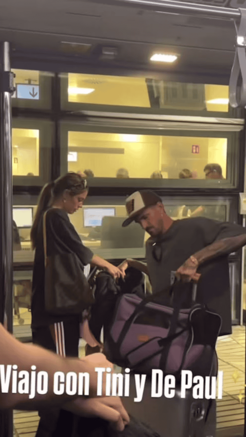 Ambos se mostraron con looks relajados y gafas de sol. É. vestía una gorra, remera gris y cargaba dos valijas —una violeta y otra plateada—, mientras que Tini optó por un conjunto deportivo oscuro con franjas en las calzas y un buzo holgado.