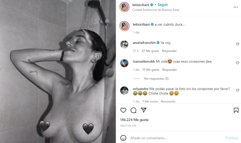La actriz Leticia Sicialiani compartió una foto en topless en la ducha y, en cierto modo, desafió “las reglas” de Instagram sobre a desnudez.