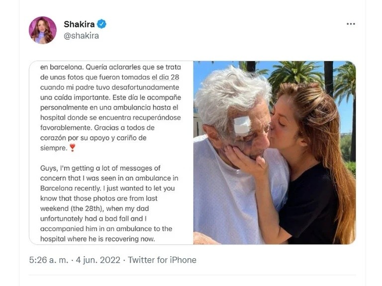 En la publicación añadió una foto junto a su padre William Mebarak Chadid, un hombre de más de 90 años, y se ve que se lastimó en la cabeza: "Este día le acompañé personalmente en una ambulancia hasta el hospital donde se encuentra recuperándose favorablemente. Gracias a todos de corazón por su apoyo y cariño siempre", finalizó la barranquillera.
