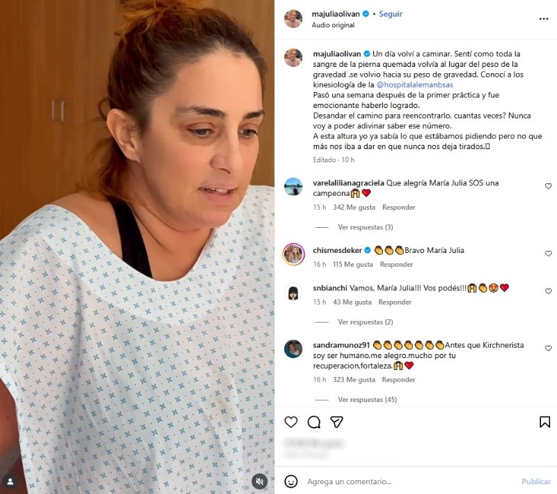 La periodista María Julia Oliván reapareció en redes sociales tras el accidente doméstico que sufrió el último junio, que le produjo quemaduras en el 25 por ciento de su cuerpo. Oliván lleva dos meses internada y se sometió a distintas operaciones para reconstruir tejidos.