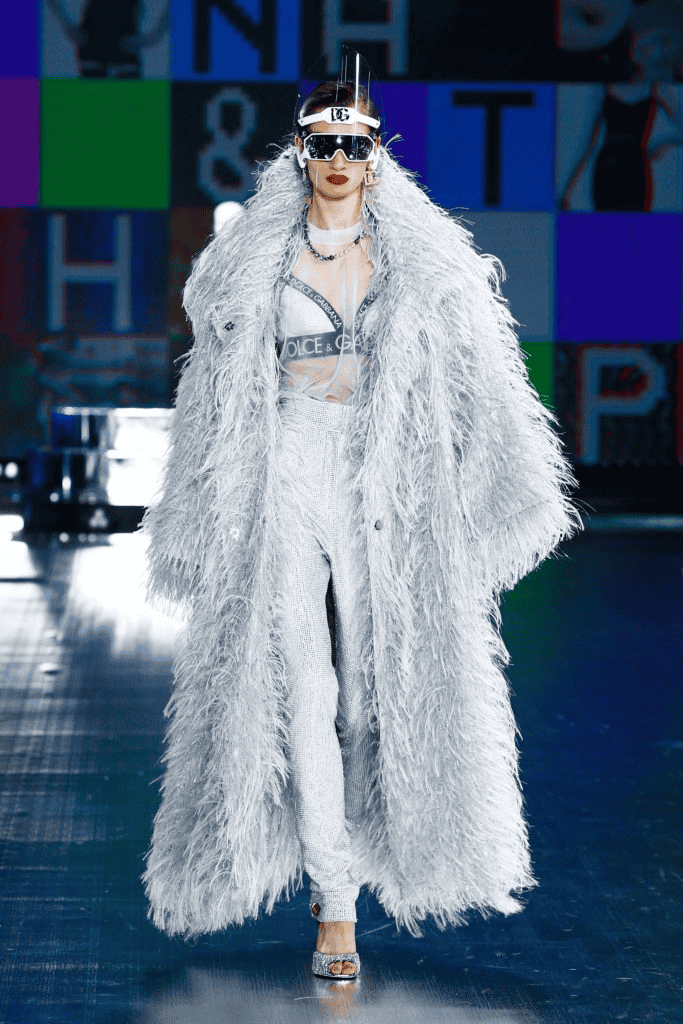 La colección de los diseñadores italianos está inspirada en los procesos tecnológicos y la inteligencia artificial. La mujer del próximo otoño/invierno está lejos de la tradicional idea de "mamma" mediterránea de la firma. Se tiñe el pelo de colores imposibles, mira a la cámara. Además protege su rostro del coronavirus con pantallas transparentes.