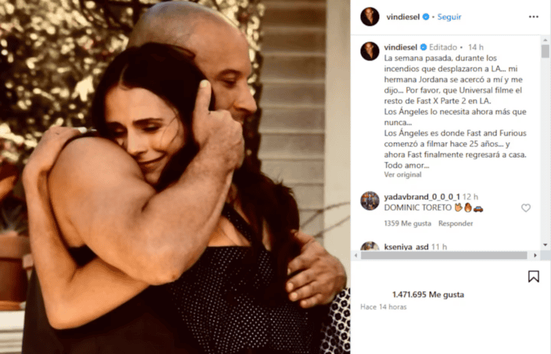 “La semana pasada, durante los incendios que desplazaron a Los Ángeles, mi hermana Jordana se acercó a mí y me dijo ‘Por favor, que Universal filme el resto de Fast X Parte 2 en LA. Los Ángeles lo necesita ahora más que nunca’”, fueron las primeras líneas de su mensaje.