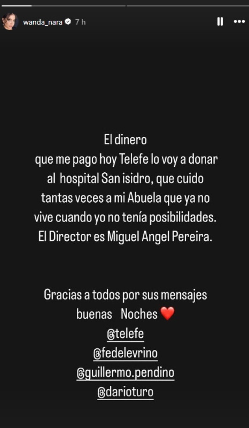 En las últimas horas, a través de una historia, Wanda indicó que el dinero que recibió por la entrevista con Susana Giménez será donado a un hospital de San Isidro que “tantas veces” cuidó a su abuela, ya fallecida.