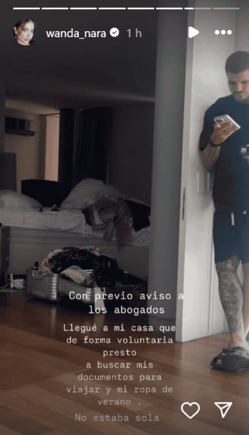 La conductora no dejó pasar esos comentarios y usó sus redes sociales para explicar el contexto. En un video donde muestra valijas y a Icardi en un rincón con el celular en la mano, escribió: "Con previo aviso a los abogados llegué a mi casa que de forma voluntaria presto, a buscar mis documentos para viajar y mi ropa de verano", dijo y agregó: "No estaba sola".