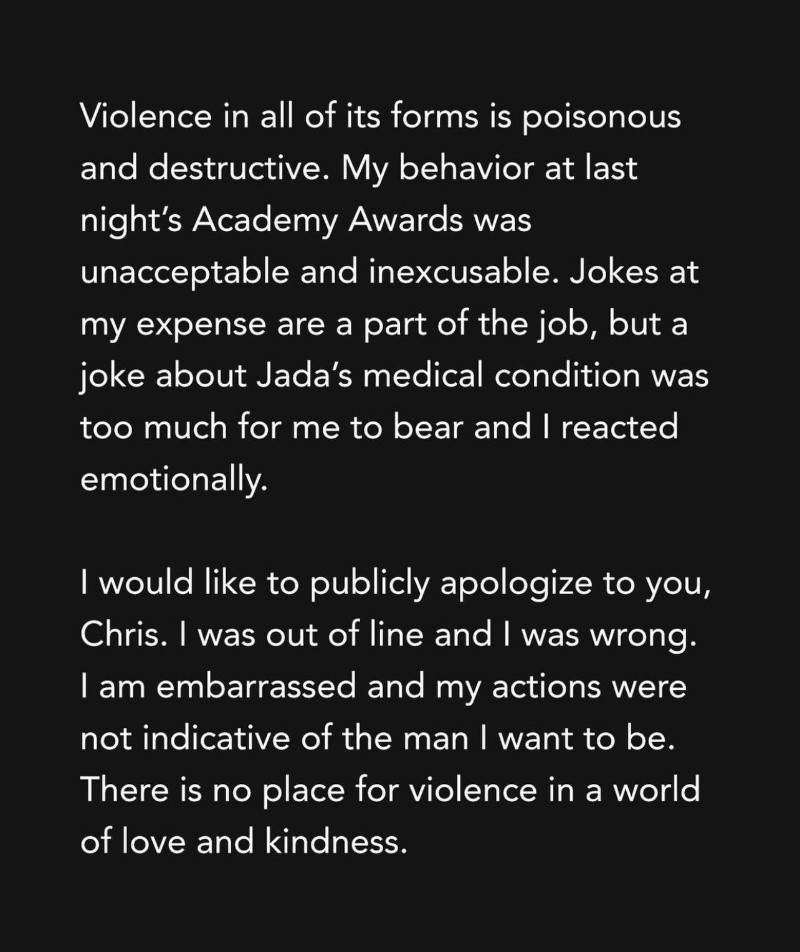 “La violencia en todas sus formas es venenosa y destructiva. Mi comportamiento en los Premios de la Academia de anoche fue inaceptable e inexcusable. Las bromas a mi costa son parte del trabajo, pero una broma sobre la condición médica de Jada fue demasiado para mí y reaccioné emocionalmente”, escribió el actor.