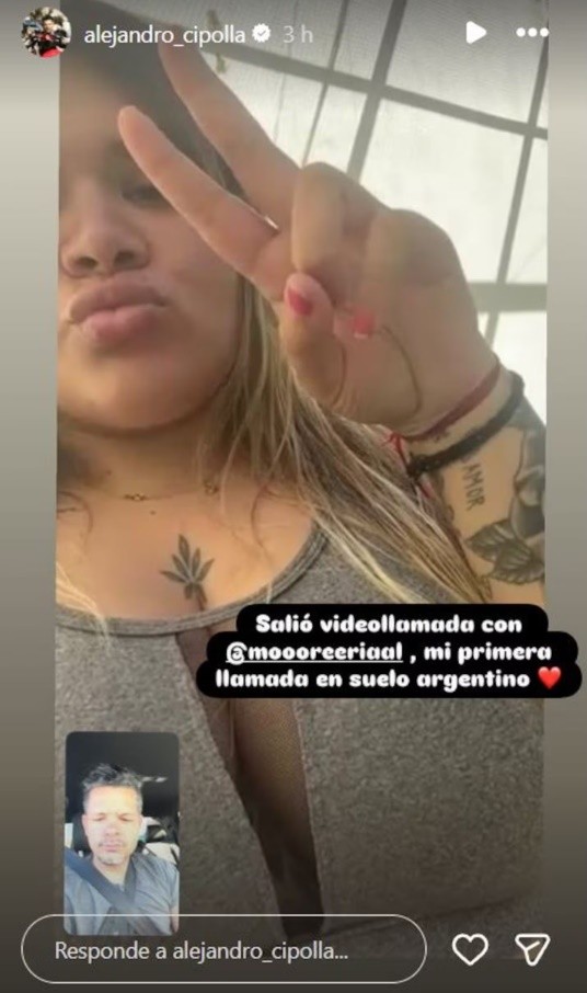 “Salió videollamada con More Rial. Mi primera llamada en suelo argentino”, escribió Cipolla junto a la imagen. En la foto, Morena está en primer plano, con dedos de una mano en “V”.