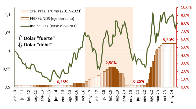 A esto se agrega la postura que podría adoptar la Fed en su política monetaria y su impacto en la cotización del dólar en los mercados mundiales. Basta tener en cuenta que, para Trump, es importante una reducción de los impuestos para las empresas, lo cual podría elevar el déficit fiscal de los EE.UU. si el crecimiento económico no es lo suficientemente potente. Tal situación podría afectar el recorrido de reducción de tasas de interés que viene realizando la Fed en los últimos meses, actualmente en 4,75% anual desde un máximo de 5,50% dos meses atrás, si la autoridad monetaria llegara a percibir mayores riesgos inflacionarios.