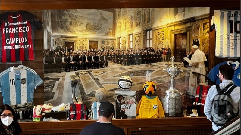 Caminaba por los recodos del Vaticano en el final de la pandemia. Aun con barbijos, distancias y cuidados, husmeábamos tras los gestos argentinos en un Estado comandado por un criollo. Nos detuvimos en una enorme vitrina en un pasadizo entre salones. Apilados bajo un orden casual, el Papa y el fútbol. Camisetas, retratos, pelotas, botines y hasta una réplica de la Copa Libertadores, estampados en una pared como una huella digital del Jefe de ese Estado Espiritual. Como el dulce de leche, el truco y el bondi: la alegría popular del fútbol argentino.
