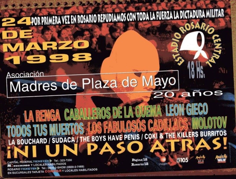 Para los que no saben o no lo reecuerdan, el 24 de marzo de 1998 las Madres de Plaza de Mayo organizaron un mega recital en la cancha de Rosario Central con bandas como Los Fabulosos Cadillacs, Todos tus muertos, Molotov, Coki and the killer Burritos, Sudaca, La Renga y un montón más de bandas que eran parte de mi vida. En particular yo andaba loco con un disco: “¿Dónde jugarán las niñas?”, de Molotov. Así que cuando lean el final de esta historia quiero que se focalicen en lo que sacrifiqué en pos de mis ideales.