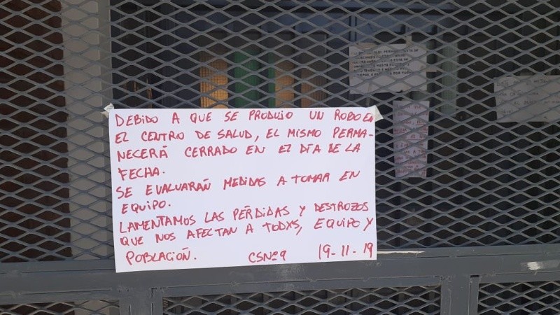 “Debido a que se produjo un robo en el centro de salud, el mismo permanecerá cerrado en el día de la fecha. Se evaluarán las medidas a tomar en equipo. Lamentamos las pérdidas y destrozos que nos afectan a todos, equipo y población”, sostiene el comunicado de los trabajadores del centro.