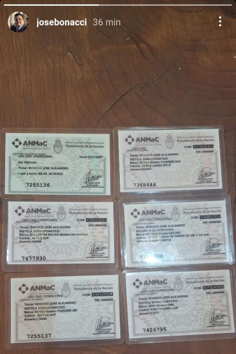 Después del operativo, Bonacci dio a conocer a través de una historia de Instagram sobre la legalidad de las armas incautadas, mostrando seis carnets habilitantes por la Agencia Nacional de Materiales Controlados (Anmac).