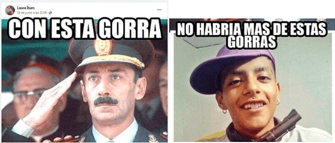 La nueva autoridad de la localidad, ubicada a 75 kilómetros al noroeste de Rosario, subió una imagen partida con Videla vestido de uniforme y en la inferior a un joven con gorrita y un arma en la mano. "Con estas gorras, no habría más estas gorras", dice el texto.
