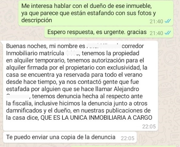 La casa en cuestión sí estaba en alquiler, pero por inmobiliaria. "Nos comunicamos con la inmobiliaria que nos respondió y nos dijo que ya tienen una denuncia radicada porque este mecanismo ya lo llevaron adelante con otro nombre", contó Ana.