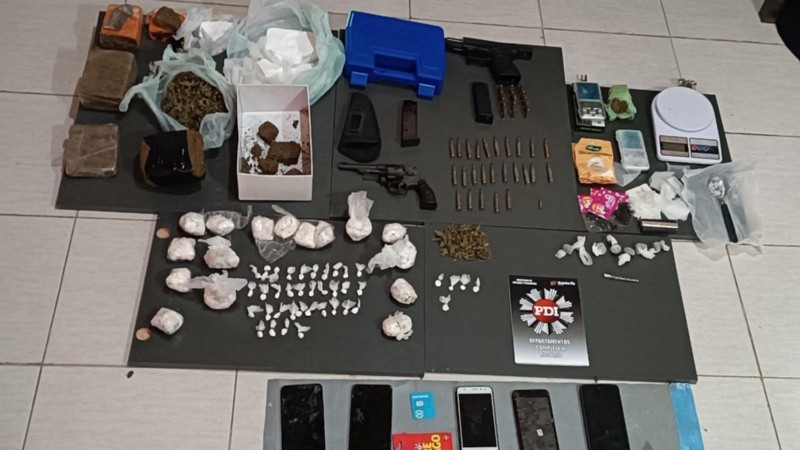 Además, se secuestraron 729 envoltorios de cocaína listos para su venta, marihuana prensada en ladrillos, flores y bochas fraccionadas, cocaína en piedras y trozos, una pistola 9 milímetros con cargador y 15 municiones, un revólver calibre 32, 25 cartuchos calibre .223, balanzas de precisión, anotaciones, recortes de nylon, bicarbonato y otros elementos de corte y estiramiento, cinco teléfonos celulares, tres chips de celulares y una pistolera interna.