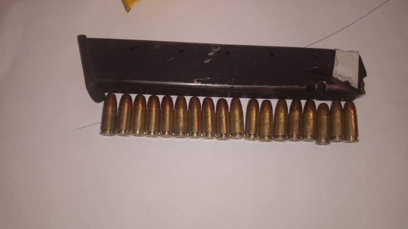 En la requisa, los policías encontraron dentro de la mochila que trasladaba uno de los dos hombres un cargador de arma de fuego con capacidad para 30 municiones calibre 9 milímetros y 18 balas.