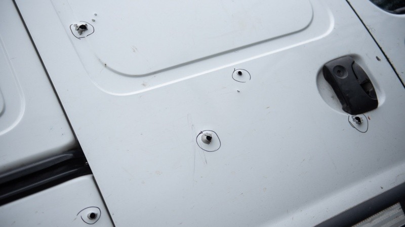 La mayoría de los disparos impactaron contra el lateral izquierdo del utilitario, sobre todo en la parte trasera, e incluso algunos atravesaron la chapa del costado opuesto y dañaron a un auto que estaba estacionado casi a la par.
