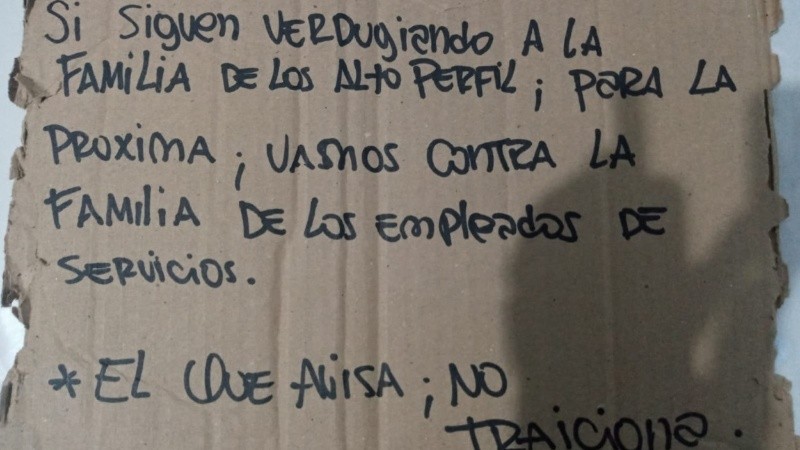“Si siguen verdugueando a la familia de los alto perfil, para la próxima, vamos contra la familia de los empleados de servicios, el que avisa no traiciona”, decía la amenaza escrita en fibrón sobre un trozo de cartón.
