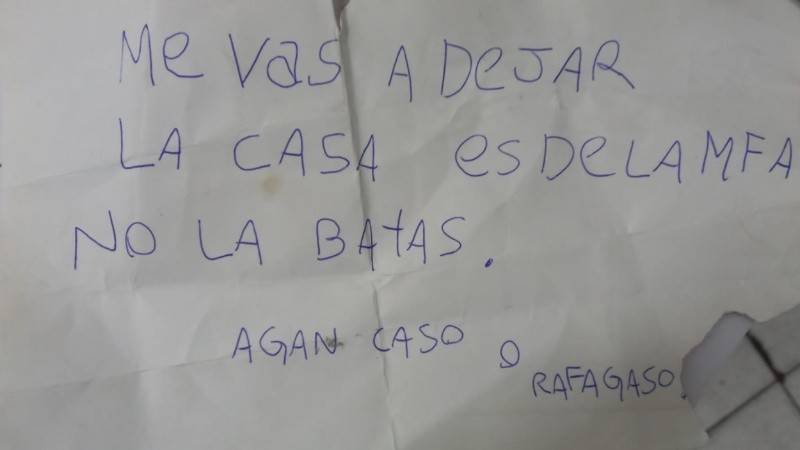 “Me vas a dejar la casa. Es de la mafia. No la batas. Hagan caso o rafagazo”, decía el papel con errores de ortografía que le dejaron a la víctima el pasado sábado, y que hizo entrega a la Policía que se hizo presente en el domicilio.