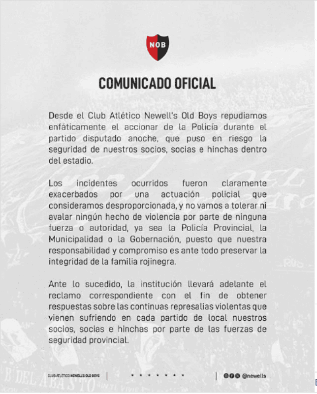 Desde el Club Atlético Newell’s Old Boys repudiamos enfáticamente el accionar de la Policía durante el partido disputado anoche, que puso en riesgo la seguridad de nuestros socios, socias e hinchas dentro del estadio.
