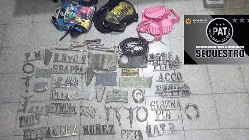 En este último caso, el ladrón estaba afuera del cementerio retenido por un civil que dijo verlo salir con tres mochilas. Entre todas contenían 43 placas, ocho llaves de bocas, dos destornilladores y una espátula.