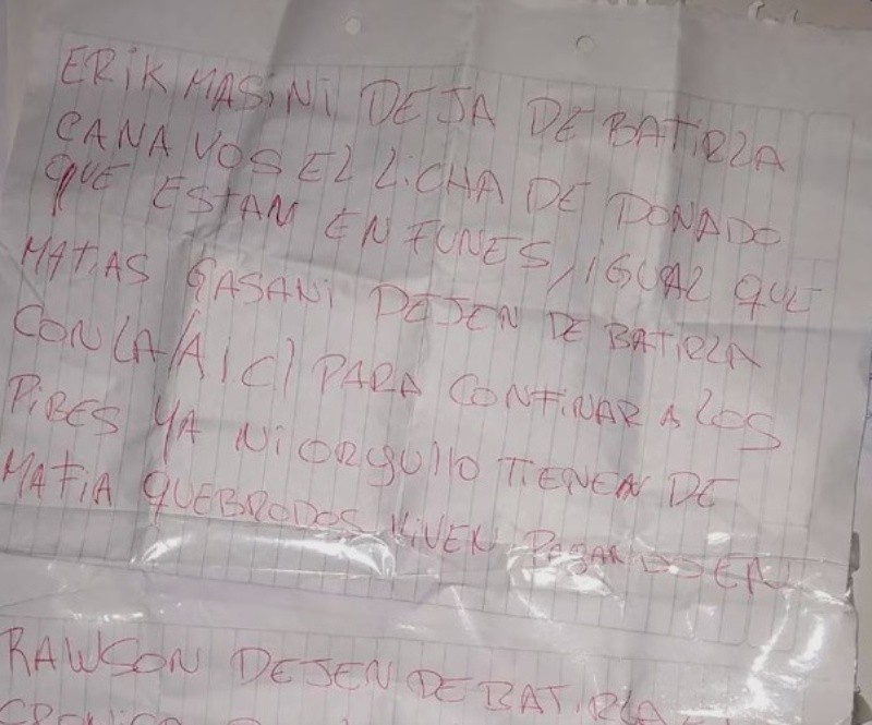 El cartel que dejó el gatillero no dejó dudas sobre los integrantes de la alianza disidente: “Erik Masini, dejá de batir la cana vos, el Licha de Donado que está en Funes, igual que Matías Gasani, dejen de batirla con la AIC para confinar a los pibes, ya ni orgullo tienen de mafia, quebrados, viven pagando en Rawson, dejen de batirla en Crónica, decile al Chaqueño Fabio Jiménez, Leandro Vilches, Nico Camino, Andi Benítes que se paren de mano sin batirla ni matar gente inocente y sin la policía, vigilantes”.