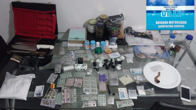 En el departamento de pasillo, además de realizarse las detenciones, se incautaron bochitas de cocaína, frascos con flores de marihuana y fármacos.