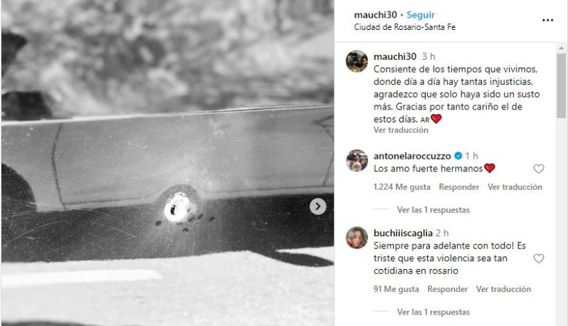 Acompañada de una imagen que muestra el impacto de bala sobre la puerta del Chevrolet Cruze, Mauricio Scaglia, primo de Antonela Roccuzzo, hizo una reflexión sobre el violento episodio de inseguridad que tuvo como víctima a su hermana Agustina, la gerenta del supermercado Único, y a dos empleados, el día miércoles por la mañana.