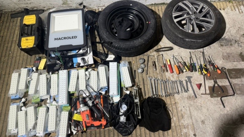 En su vehículo, Agustín M. tenía una rueda completa de auto llanta marca Peugeot, otra con la llanta marca Toyota, una caja de herramientas, llaves saca tuercas, destornilladores, una palanca, una llave T de tubo, un martillo sin mango, una pinza, un cuchillo, una sierra de mano, un taladro, un gato tijera, un compresor, un reflector, luces de emergencia, dos llaves de auto Peugeot, una llave de auto marca Chevrolet, una llave cruz, un pasamontañas negro y tapones de llanta con el logo de Peugeot.