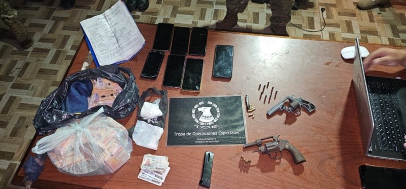 Como resultado de una investigación el personal de TOE allanó tres viviendas en calle Ombú S/N y Rucci al 1800 donde aprehendieron a siete varones –tres menores y cuatro mayores– e incautó dos revólveres –calibres .32 y .38–, un cargador de pistola 9 milímetros, 65 gramos de cocaína y 800 mil pesos en efectivo.