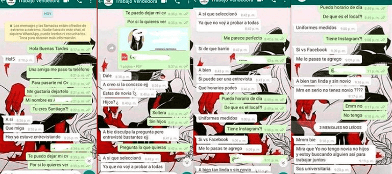 “Mmm tan linda y sin novio. ¿En serio no tenés novio?”, le dice el acusado en uno de los chats a otra joven a la que contactó. “Mirá que yo no tengo novia ni hijos y estoy buscando a alguien así para trabajar juntos”, le respondió la mujer.