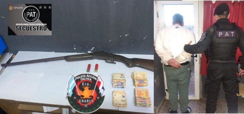 En el patrullaje pedestre permitió aprehender a un hombre de 36 años en su domicilio. En el lugar, se secuestró una escopeta calibre 16 con culata de madera y un caño de metal, cartuchos para dicha escopeta y la suma de 313.000 pesos.