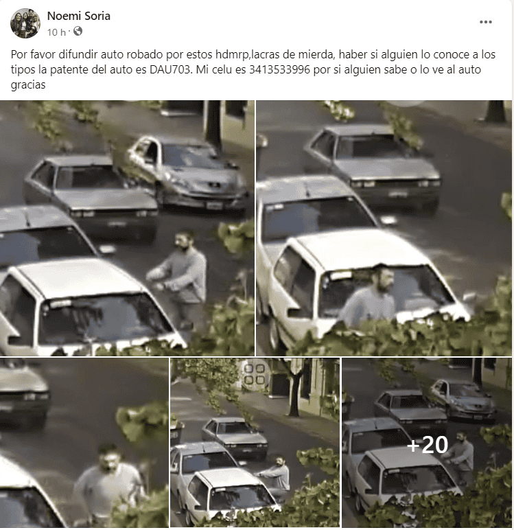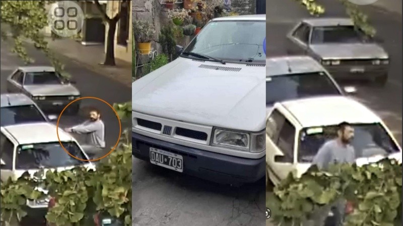 El vehículo fue robado en tan solo tres minutos. Pero en el video completo que brindó la víctima a Rosario3, los ladrones estuvieron al menos 10 minutos merodeando alrededor del auto, abriendo el capó del vehículo y viendo cómo llevárselo. Se trata de un Fiat Uno blanco patente DAU 703.