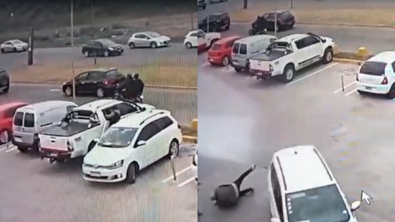 La secuencia quedó filmada por las cámaras de videovigilancia del predio de la zona noroeste de Rosario. Se logra ver que los ladrones estacionan de culata al lado de la camioneta, y quien estaba en el asiento del acompañante se baja, estalla el cristal derecho trasero y sustrae el bolso, que aparentemente tenía una computadora y dinero.
