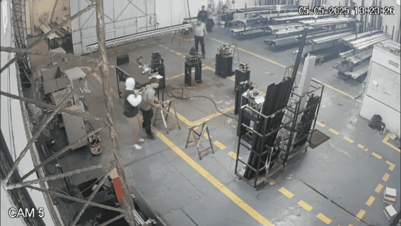 En la filmación se ve como pasadas las 13.20 un trabajador de la empresa se dispone a cerrar el portón de ingreso cuando es interceptado por los ladrones que rápidamente lo reducen y trasladan hasta el fondo del galpón junto con el resto de los operarios.