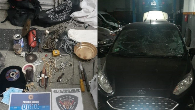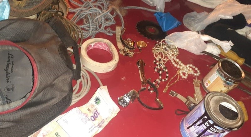 El sospechoso fue encontrado dentro del galpón, en el interior de un utilitario blanco. Se le secuestró una mochila que contenía una moladora, una cinta métrica, dos destornilladores, una cinta de papel, dos rollos de cables, dos discos de corte, cuatro relojes de pulsera, una pulsera de metal, tres cadenitas de oro, prendedores plateados y trozos de soga.