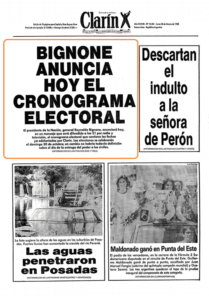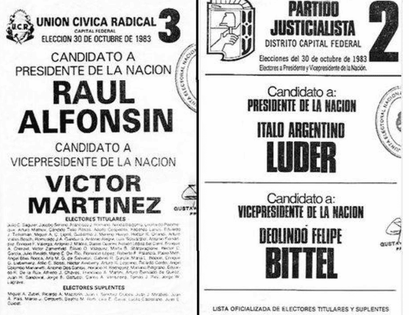 El 28 de febrero de 1983, el último dictador Reynaldo Bignone confirmó el cronograma electoral: fijó los comicios para el domingo 30 de octubre. En ese momento, señaló: “90 días más tarde, es decir el 30 de enero de 1984, será entregado el poder a quienes resulten electos”.