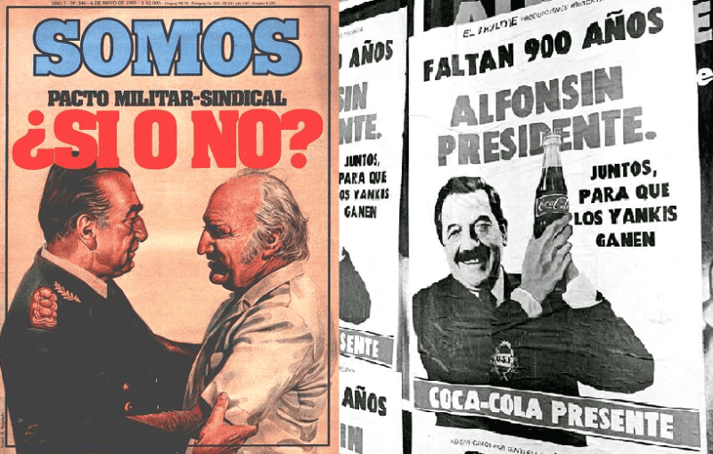 Con las fórmulas afianzadas, Alfonsín denunció (sin pruebas) que existía un “pacto militar y sindical” para garantizar la impunidad a los crímenes de lesa humanidad si el PJ se imponía. La respuesta a la acusación era que el radical era el candidato de la Embajada de Estados Unidos y se vendía como una Coca Cola.