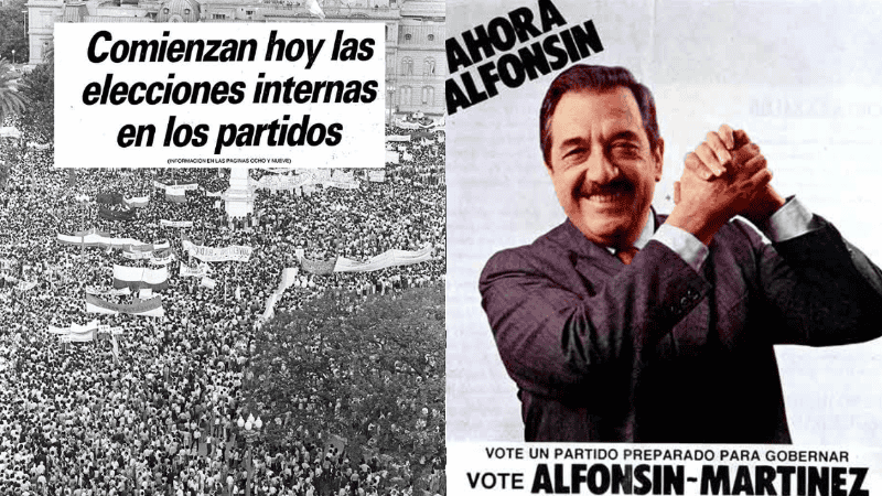 En ese marco, el primer paso concreto de la transición llegó el domingo 12 de junio 1983, con el inicio de las internas de la Unión Cívica Radical (UCR). El Movimiento de Renovación y Cambio encabezado por Raúl Alfonsín se enfrentó a la Línea Nacional de Fernando De la Rúa.