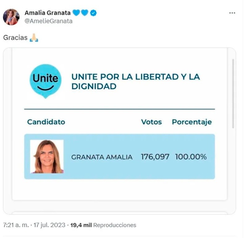 Amalia Granata fue la segunda candidata más votada en las Paso el pasado 16 de julio. La diputada provincial le siguió en los resultados al actual gobernador, Omar Perotti, y se encamina a la renovación de su banca. Tras el batacazo, dialogó con Radio 2, y aconsejó "no subestimar su espacio". "Ya me ven con otros ojos, no se ríen tanto como al principio”, advirtió, en referencia a las críticas que cosechó al saltar de la pantalla porteña a la política santafesina. Contó cuál fue la clave de su campaña, volvió a apuntar contra Carolina Losada y anticipó que en las elecciones presidenciales no votará a Javier Milei.
