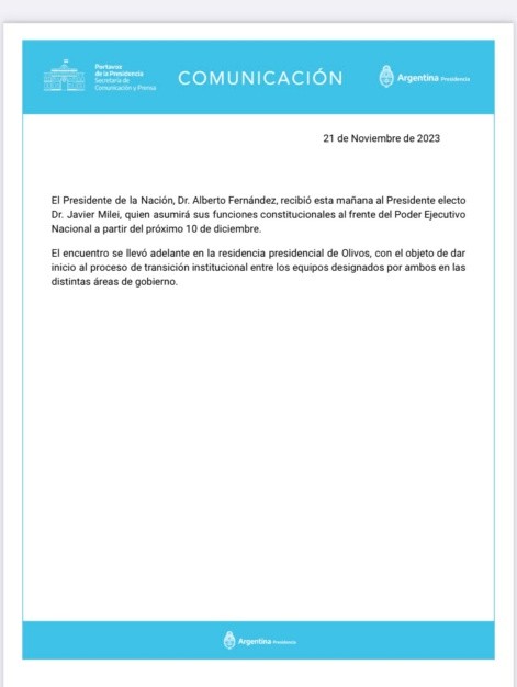 "El presidente de la Nación, Alberto Fernández, recibió esta mañana al presidente electo Javier Milei, quien asumirá sus funciones constitucionales al frente del Poder Ejecutivo Nacional a partir del próximo 10 de diciembre. El encuentro se llevó adelante en la residencia presidencial de Olivos, con el objeto de dar inicio al proceso de transición institucional entre los equipos designados por ambos en las distintas áreas de gobierno", reza el escueto comunicado oficial que acompaña la foto de Fernández y Milei.