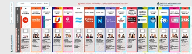 Las elecciones legislativas de 2025 introducen la Boleta Única de Papel (BUP) en todo el territorio nacional, un instrumento que busca modernizar y transparentar el proceso electoral. Su objetivo primordial es garantizar la presencia de la totalidad de la oferta electoral en cada centro de votación, y así eliminar la posibilidad de que falten boletas de algún partido. Este sistema electoral ya se viene implementando en Santa Fe, para comicios provinciales. En la boleta, los partidos políticos se organizan verticalmente en columnas, mientras que las categorías de cargos a elegir se presentan horizontalmente en filas. Al lado de cada cargo, se dispondrá una casilla en blanco para que el votante marque con una tilde a su candidato o lista de preferencia. Este formato busca simplificar la identificación de las opciones disponibles. Habrá dos modelos de Boleta Única de Papel, según la jurisdicción, debido a la variación de cargos a elegir. Por un lado, los candidatos a senadores nacionales estarán identificados con nombre y apellido, y su fotografía color. Para el caso de la lista de diputados, tendrán como máximo los nombres y apellidos de los primeros cinco candidatos de la lista, a excepción de los distritos que elijan un número inferior. En todos los casos se incluirá la fotografía color de los primeros dos postulantes. En Santa Fe, sólo se elegirán diputados nacionales. En Santa Fe, la boleta incluye 16 fuerzas políticas que presentan junto a sus respectivas listas. A continuación, este es el orden en que aparecen en la BUP, con sus primeros cinco candidatos a diputados: Partido Autonomista (Lista 36): Raimar Ataide Da Costa, Noelia Samanta, Vanina Mirabella, Chavo Ventura, Jesica Romina Reyes y Pedro Héctor Mariani. Igualdad y Participación (213): Agustina Donnet, Damián Verzeñassi, Ana Narvaiz, Agustín González y Romina Sotelo. Republicanos Unidos (219): Luciano Chano Rossi, Georgina Montalbano Bogey, Rubén Óscar Voisard Rezola, Romina Soledad Giménez y Gastón Iván Méndez. Provincias Unidas (503): Gisela Scaglia, Pablo Farías, Melina Giorgi, Rogelio Biazzi y Natalia María Verónica Corona. Coalición Cívica ARI (47): Eugenio Malaponte, María Inés Masino, Carlos Javier Pujol, Andrea Martínez y Lautaro Candioti. Fuerza Patria (505): Caren Tepp, Agustín Rossi, Alejandrina Borgatta, Óscar Cachi Martínez y Fernanda Gigliani. Política Obrera (92): Marilin Gómez, Germán Lavini, Alicia Escudero, Gustavo Fenoy, Stella Maris Giudice. Nuevas Ideas (227): Eze Torres, Cristina Luciani, Luciano Corti, Andrea Mansilla y Daniel Caramutti. La Libertad Avanza (96): Agustín Andrés Pellegrini, Yamile Vanesa Tomassoni, Juan Pablo Montenegro, Valentina Loana Ravera y Germán Cristian Pugnaloni. Defendamos Santa Fe (504): José Gaspar Lattuca, María Noel Montenegro, Manuel Alejandro Lafarga, Floriana Belén Marconi y Néstor Enrique Maggi. Frente de Izquierda y de Trabajadores Unidad (502): Franco Casasola, Carla Deiana, Adolfo Columbich, Fernanda Gutiérrez y Nicolás Rapanelli. Movimiento Independiente Renovador (177): Juan Carlos Blanco, Silvia Cristina Attorresi, Roberto Edgardo Forchetti, Claudia Mariel Ramírez y Víctor Hugo Gauna. Compromiso Federal (82): Gabriel Felipe Chumpitaz, Polaca Alejandra Latosinski, Federico Eduardo Cutruneo, Claudia Beatriz Giménez y Daniel Eduardo Hansen. Partido Fe (77): Pamela Ivana Perino, Juan Atilio Flaherty, Aldana Mariela Peirotti, Héctor Reynaldo Cardozo y Silvia María de Lourdes Elías. Frente Amplio por la Soberanía (501): Carlos Alfredo Del Frade, Gabriela Adelina Sosa, Luciano Martín Vigoni, Vanesa Gabriela Oddi y Pablo Francisco Bosch. Movimiento al Socialismo (13): César Rojas Esquivel, Ayelén Velizan, Iván Pilcic, Marianela Ponce y Luis Nine.¿Cómo es la BUP de las elecciones en Santa Fe?