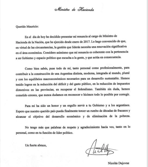 Mediante una carta, Dujovne presentó las razones su dimisión y dice al presidente que su gestión "necesita una renovación significativa"