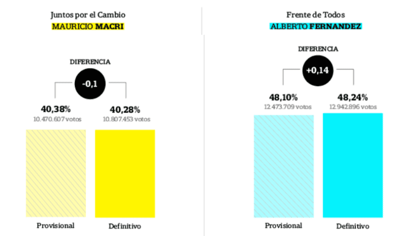 El conteo judicial confirmó el triunfo de Fernández con el 48,24% de los sufragios frente al 40,28% del actual presidente.